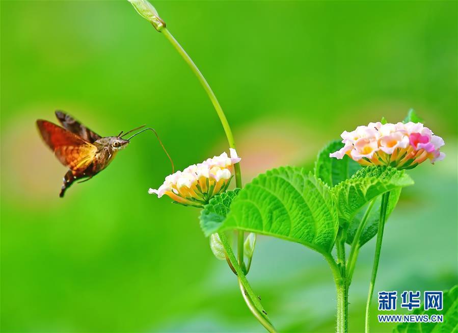 在福建省福州市溫泉公園,蜂鳥鷹蛾在花間飛舞(8月18日攝)。近日,福建省福州市溫泉公園內的馬纓丹大面積開放?;t、草綠、蟲飛,構成了一幅和諧的閩都生態圖景。 新華社記者梅永存攝