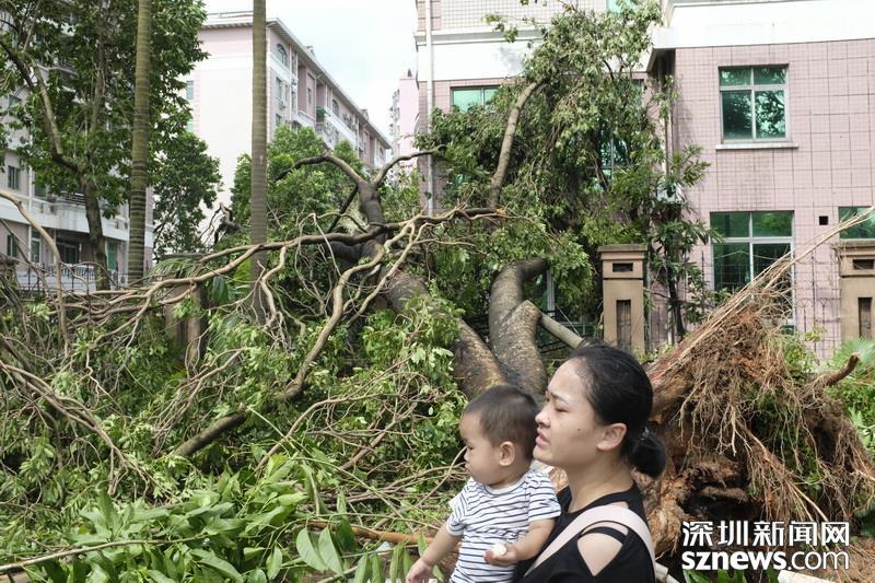 2018年9月17日10點16分,商報路,一對父子走過倒塌的樹木旁邊。(攝影:楊浩翰)