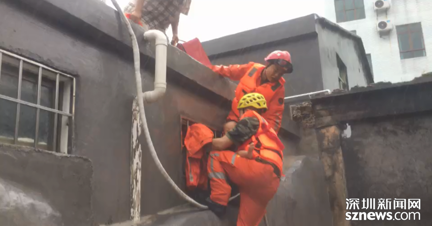 大鵬新區南澳東山碼頭籃球場旁邊樓房三樓,受臺風影響水位上升,現場3人被困,大鵬直屬中隊緊急出動1輛水陸兩用車,1輛消防車,6名指戰員趕赴現場。經過1個多小時的救援,于13點26分成功解救2名成年人、一名小孩。