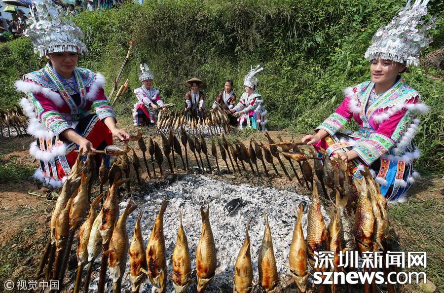 廣西柳州市融水縣山區有插秧時節放養鯉魚苗的習俗,金秋時節稻熟魚肥,收稻燒魚成為別致一景。