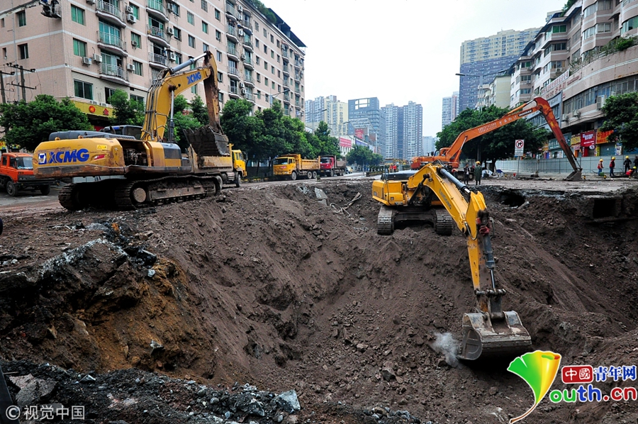 中國青年網北京10月9日電 2018年10月8日消息,四川達州。10月8日從四川省達州市達川區委宣傳部獲悉,7日14時30分左右,達川區東環南路103號人行道路面發生塌陷險情,經調取視頻監控和走訪周邊群眾,救援人員初步判斷疑似有4人掉入坑中。圖片作者:視覺中國