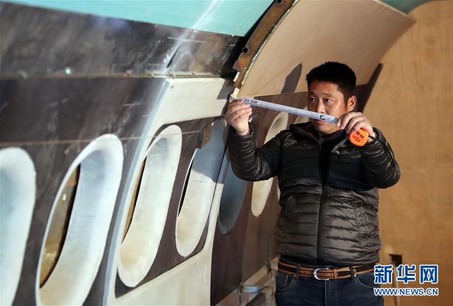 11月10日,在遼寧開原老城街道前三臺子村,朱躍在“飛機”內部測量安裝尺寸。 新華社記者 楊青 攝