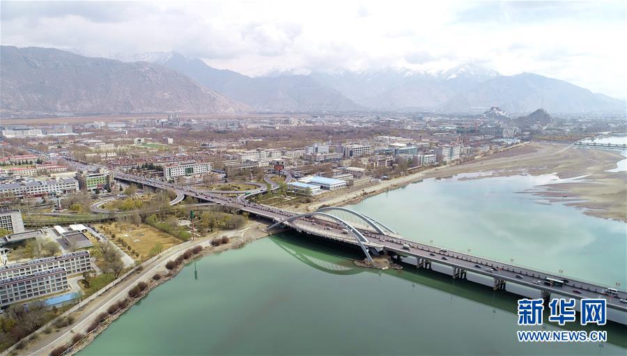這是橫跨在拉薩河上的拉薩市區公路(4月3日無人機拍攝)。 新華社記者 晉美多吉 攝
