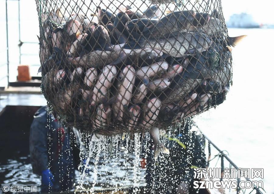 當日,浙江省杭州市淳安縣千島湖中心湖區上演巨網捕魚,30余名捕撈隊員經過半個多小時拉網,獲得大豐收。
