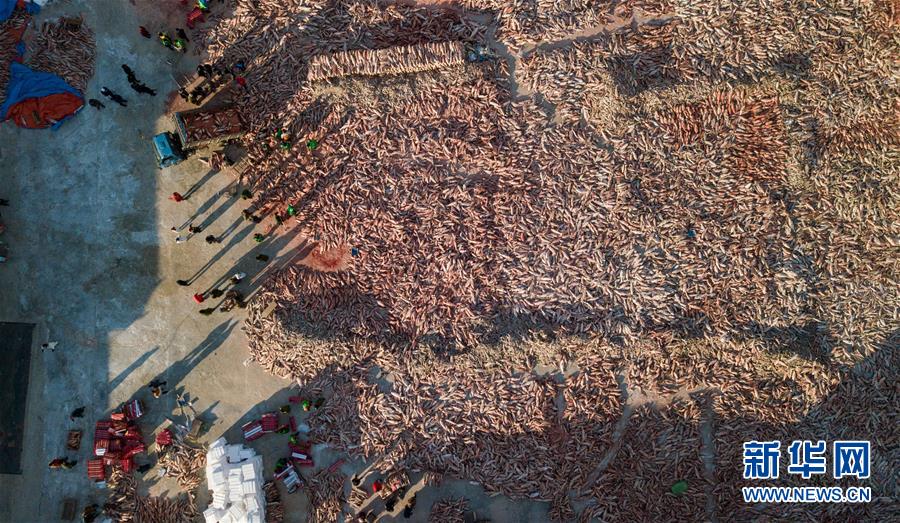 12月27日,在吉林松原查干湖漁場,工人們將魚裝箱(無人機(jī)拍攝)。新華社記者張楠攝