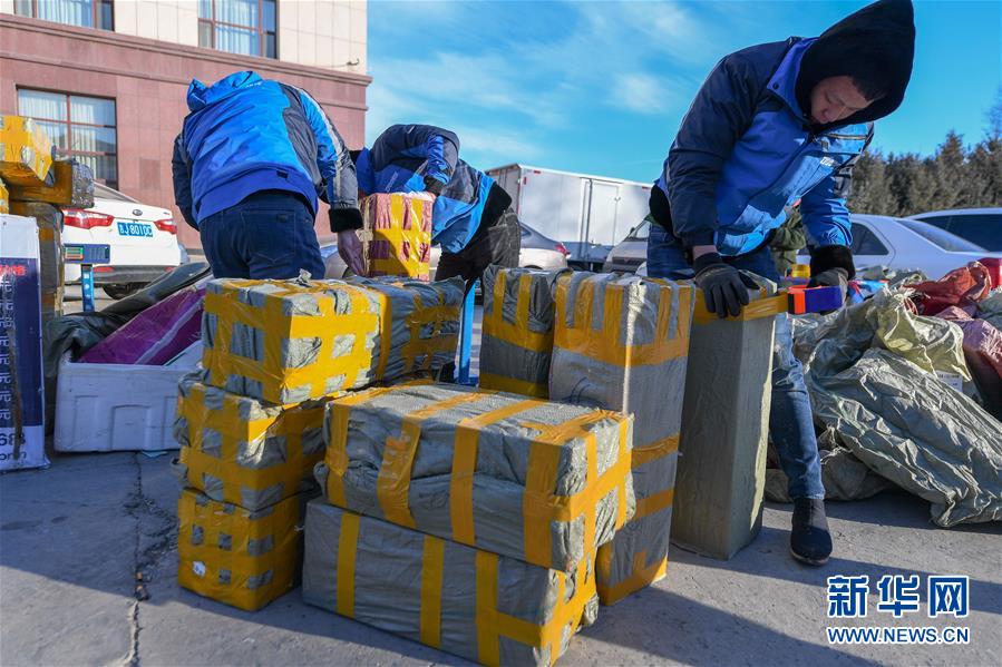 12月27日,在吉林松原查干湖漁場,快遞員將魚打包準備發給客戶。 新華社記者張楠攝