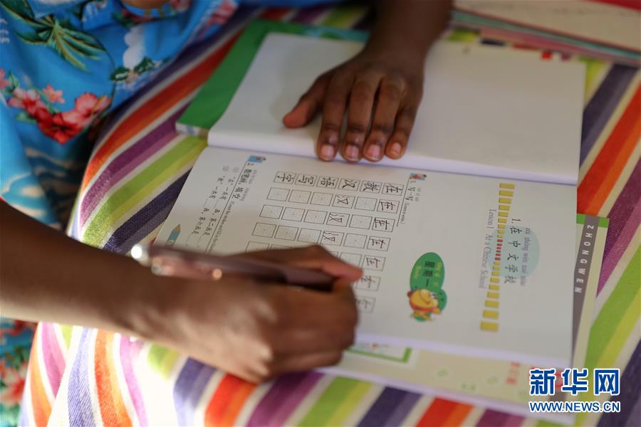 9月25日,在美國芝加哥,卡亞·恩朱比練習寫漢字。 新華社記者 汪平 攝
