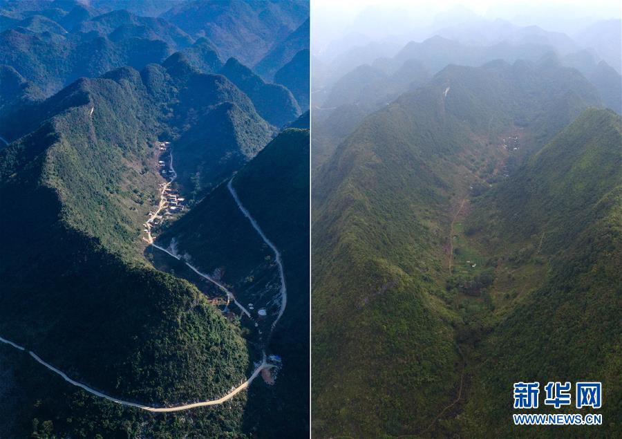 拼版照片:左圖為剛剛修通水泥路的大化瑤族自治縣板升鄉八好村弄研屯(11月11日無人機拍攝);右圖為尚未通路的八好村弄研屯(2015年11月3日無人機拍攝)。新華社記者黃孝邦攝