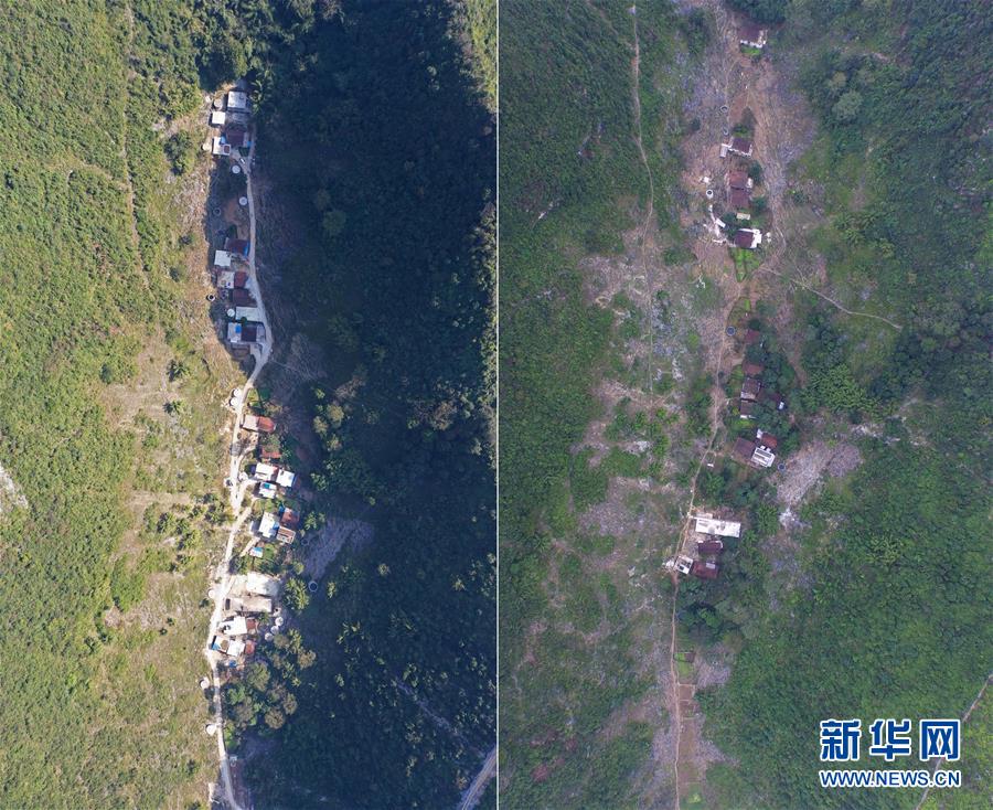 拼版照片:左圖為剛剛修通水泥路的大化瑤族自治縣板升鄉八好村弄研屯(11月11日無人機拍攝);右圖為尚未通路的八好村弄研屯(2015年11月3日無人機拍攝)。新華社記者黃孝邦攝