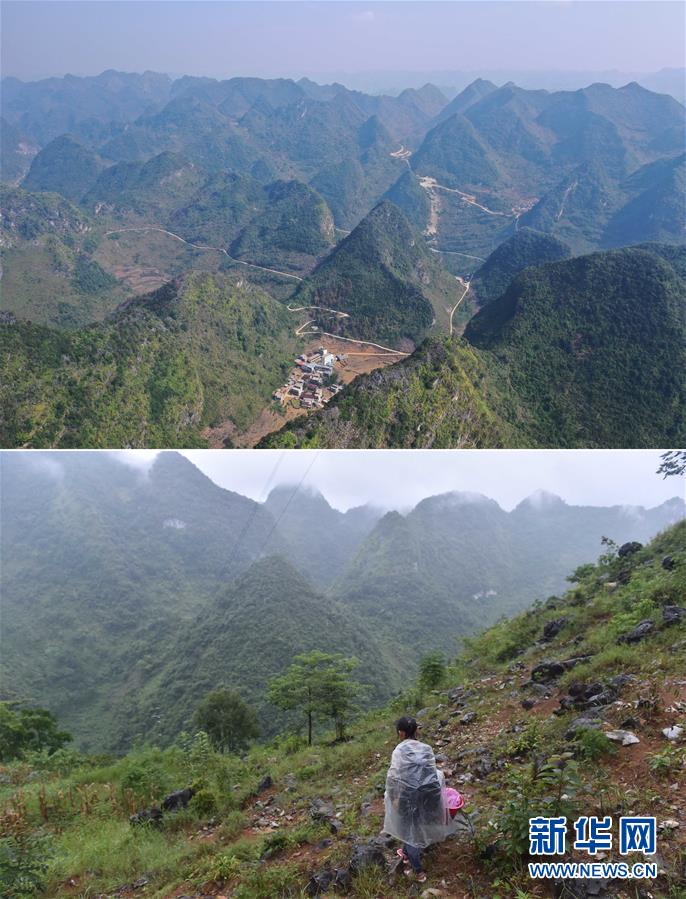 拼版照片:上圖為已經修通公路的大化瑤族自治縣板升鄉弄勇村各自然屯(11月11日無人機拍攝);下圖為在弄勇村弄炮屯,一名小學生爬山路去學校(2016年9月1日攝)。新華社記者黃孝邦攝