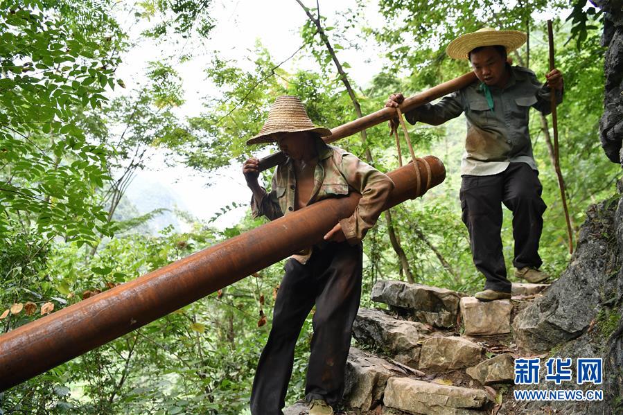 在廣西大化瑤族自治縣板升鄉弄雷村,工人們抬著抗旱飲水工程的水管在山路上前行(2016年8月10日攝)。新華社記者黃孝邦攝