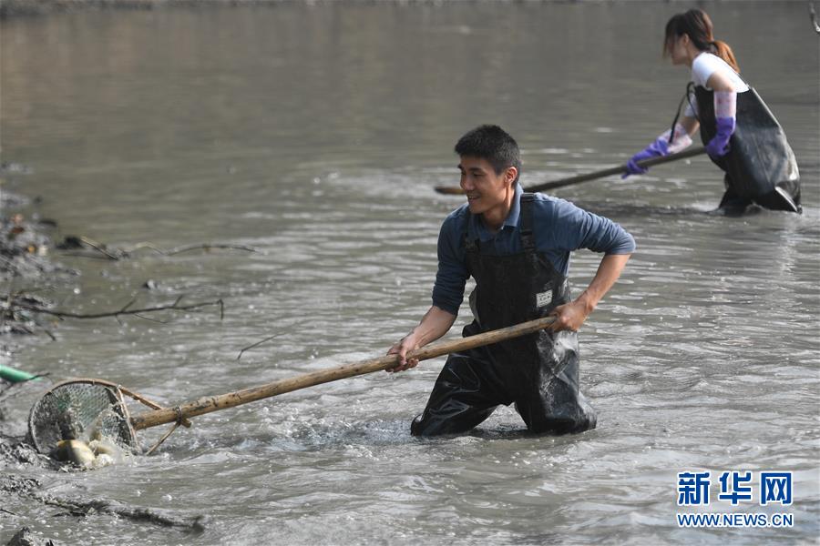 杭州:游客體驗(yàn)“干塘”捕魚