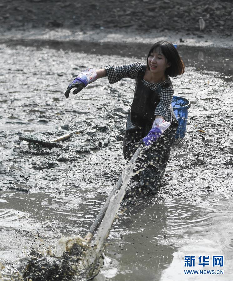 11月24日,游客在西溪濕地體驗“干塘”捕魚。新華社記者黃宗治攝