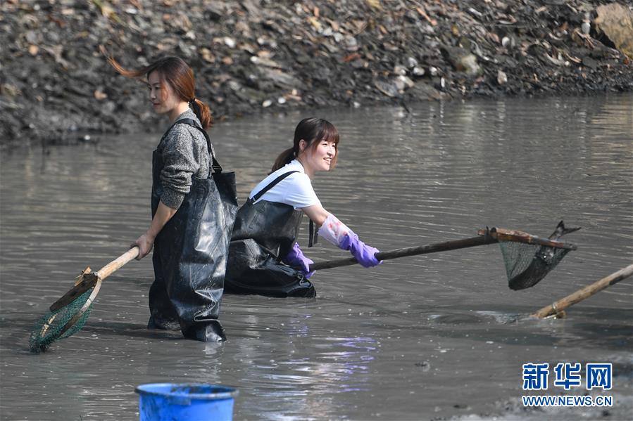 杭州:游客體驗(yàn)“干塘”捕魚