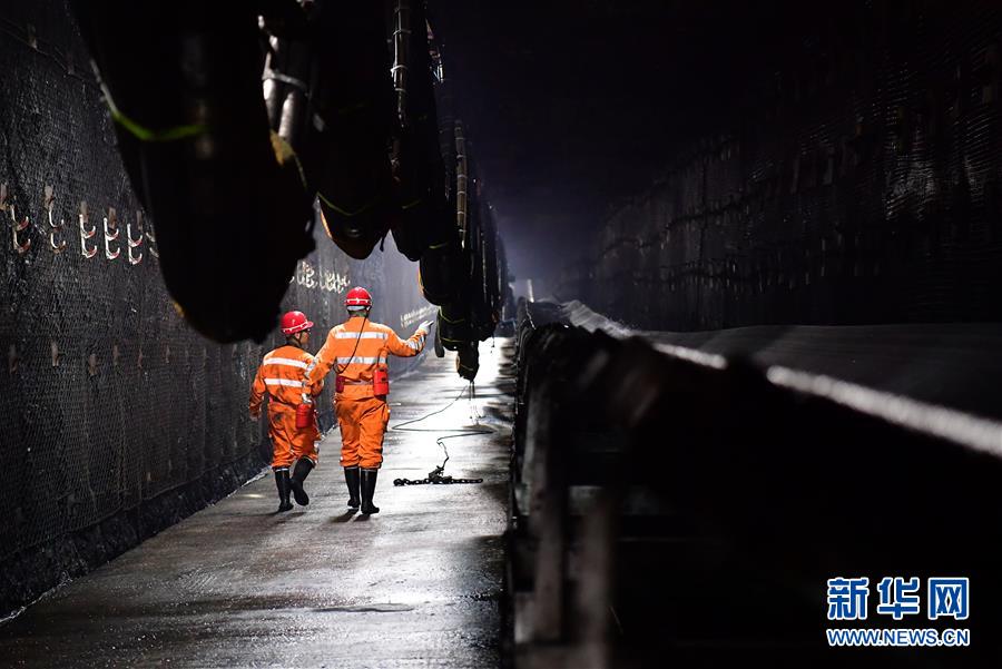 11月26日,在上灣煤礦12402綜采面內,工作人員沿著輸送帶進行巡視。 新華社記者 邵瑞 攝