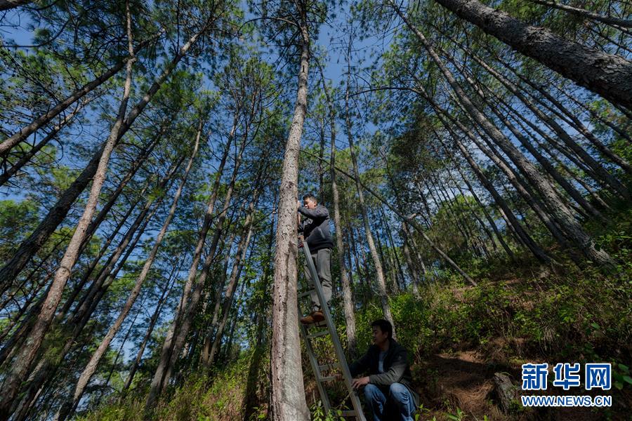 羅康(上)在哀牢山的松樹林里安裝人工鳥巢(12月12日攝)。 新華社記者 胡超 攝