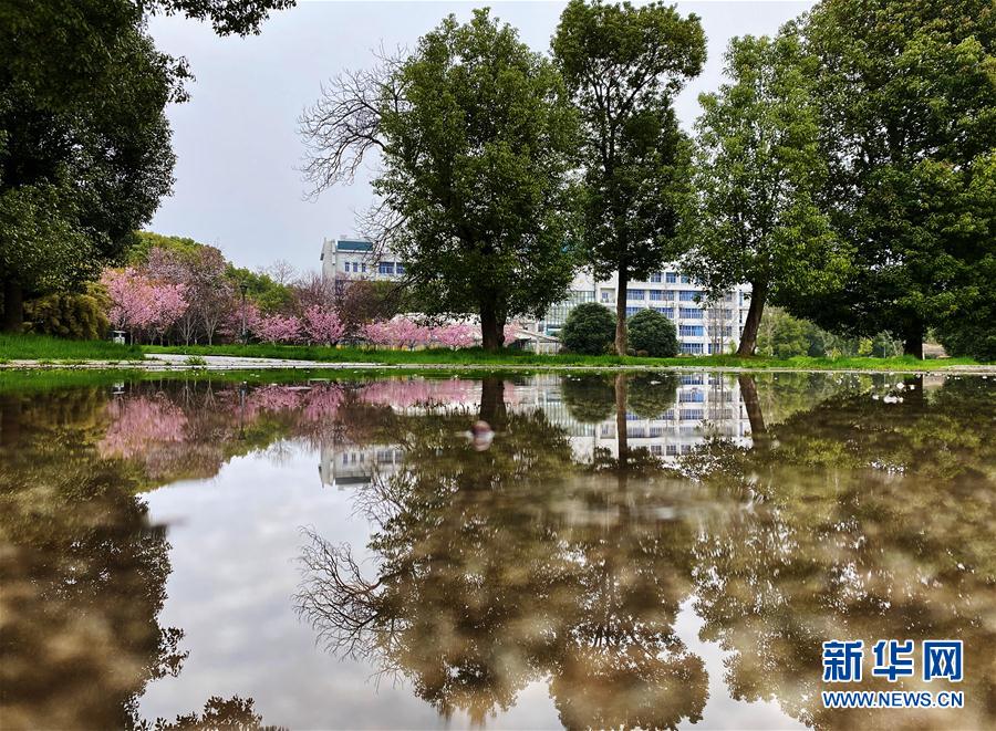 近日,隨著氣溫上升,武漢大學圖書館附近一片櫻花開放。 新華社記者 費茂華 攝