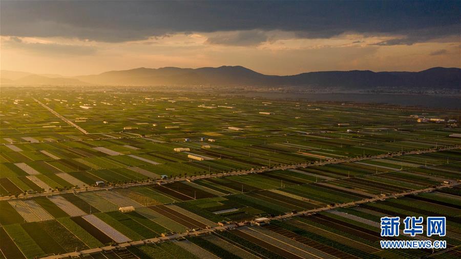 時下正值農忙時節,云南省玉溪市通海縣的農作物長勢喜人,山巒、湖水與農田組成了一幅美麗的田園詩畫卷。