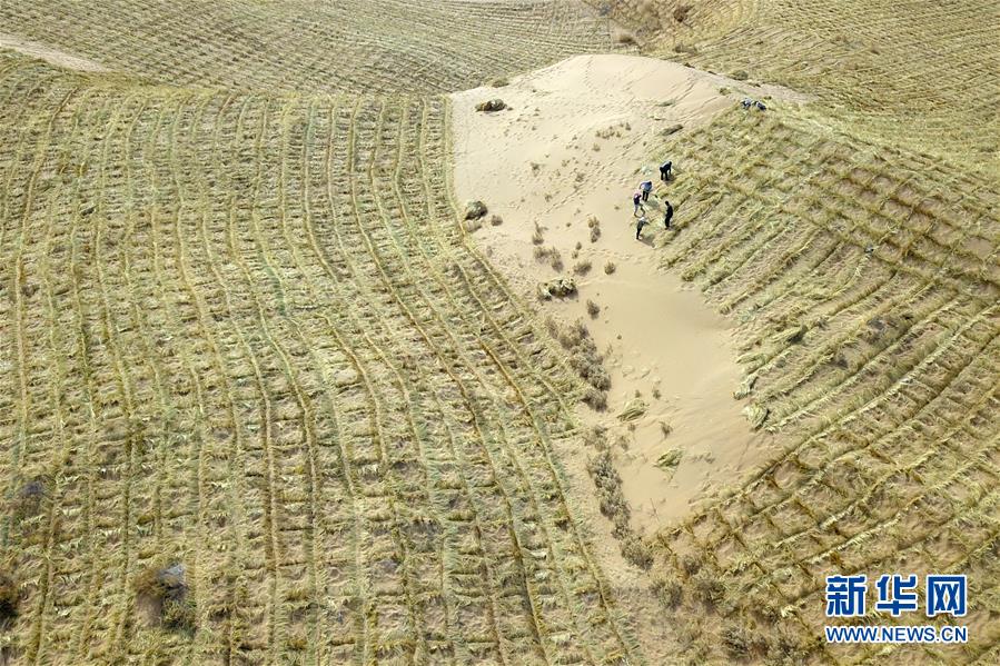 3月5日,在古浪縣北部沙區旱麻崗治沙點,群眾扎草方格壓沙(無人機照片)。初春時節,在騰格里沙漠南緣的甘肅省武威市古浪縣,當地干部職工及八步沙林場治沙人共同在縣城北部沙區旱麻崗治沙點開展春季治沙勞動。新華社記者 范培珅 攝