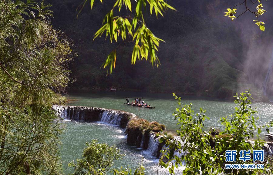 3月8日,游人在云南省曲靖市羅平九龍瀑布群風景區游覽。 初春時節,云南省曲靖市羅平九龍瀑布群風景區內,湖光山色清澈秀麗,美不勝收。 新華社記者 楊宗友 攝