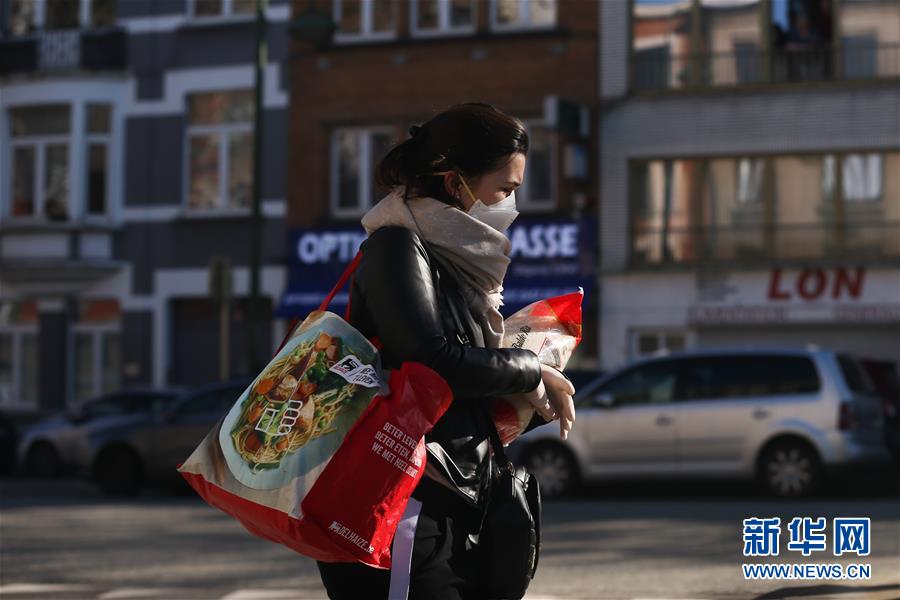 3月18日,在比利時(shí)布魯塞爾,一名女子購物后走在街道上。 新華社記者 鄭煥松 攝