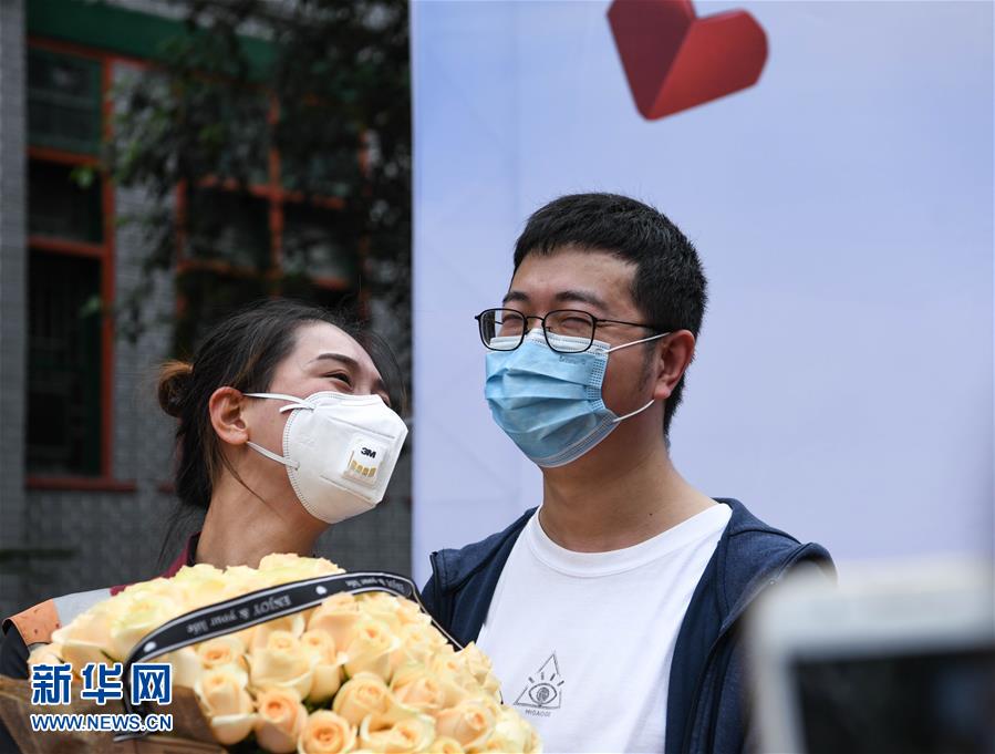 4月21日,在四川大學華西醫院,醫療隊隊員接受男友的捧花。當日,來自四川大學華西醫院、華西第二醫院、華西第四醫院的醫療隊隊員解除隔離休整,與分別許久的家人、同事團聚,緊緊相擁。新華社記者王曦攝