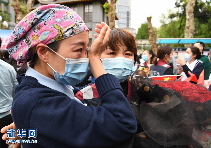 4月21日,在四川大學華西醫院,醫療隊隊員安慰流淚的同事。當日,來自四川大學華西醫院、華西第二醫院、華西第四醫院的醫療隊隊員解除隔離休整,與分別許久的家人、同事團聚,緊緊相擁。新華社記者王曦攝