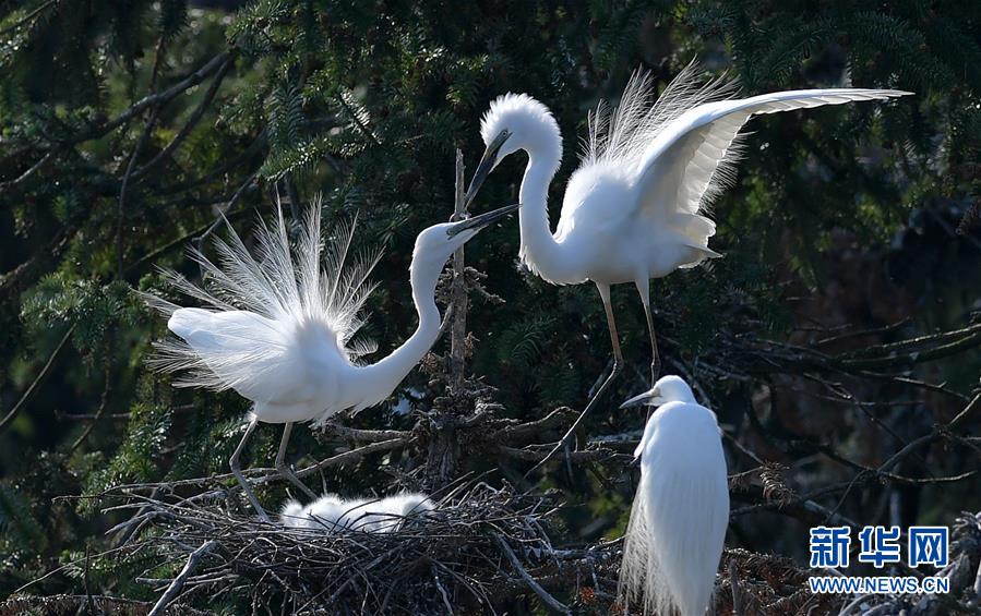 白鷺在象山森林公園嬉戲(4月26日攝)。近日,在江西省南昌市新建區(qū)象山森林公園內(nèi),已安家筑巢的大批鷺鳥(niǎo)正陸續(xù)孵化后代,一派生機(jī)勃勃的景象。新華社記者彭昭之?dāng)z
