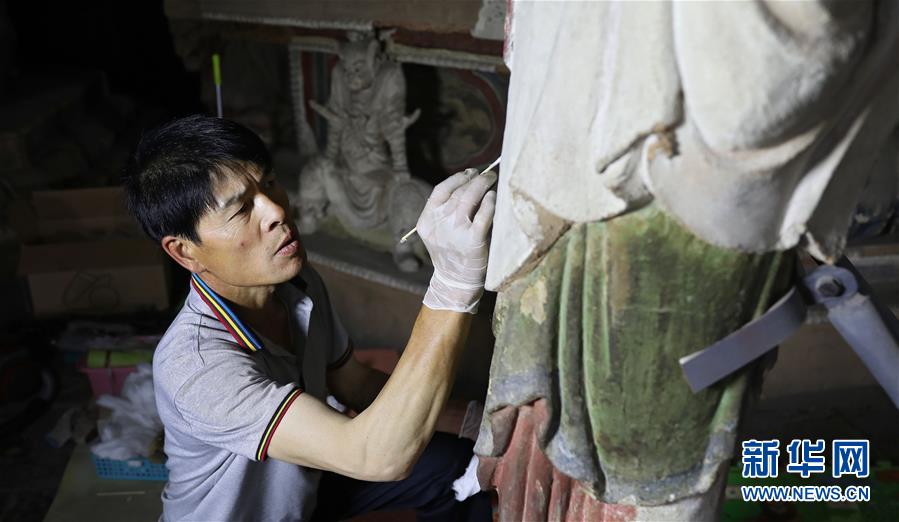 6月8日,工作人員對(duì)奉國(guó)寺的彩繪泥塑進(jìn)行保護(hù)修復(fù)。新華社記者 姚劍鋒 攝