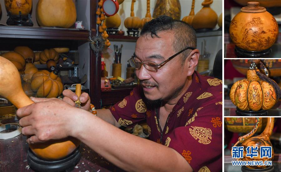 這是一張拼版照片。左:8月5日,侯景偉在葫蘆上進行創作。右:侯景偉創作的葫蘆工藝品(8月5日攝)。今年55歲的吉林四平人侯景偉自幼與家人學習雕刻、烙畫藝術。經過多年潛心研究,他將浮雕和烙畫工藝相結合,通過拋光、起稿、雕刻、烙燙、套色等十余道工藝,制作展現傳統文化、民俗故事的葫蘆工藝品。2020年,侯景偉被評為四平市非物質文化遺產項目侯氏葫蘆雕刻烙畫代表性傳承人。他說:“希望有更多人加入到非遺傳承隊伍中,讓小葫蘆‘講’出更多民俗故事。”新華社記者張楠攝