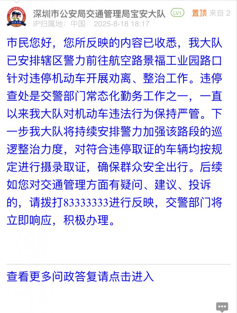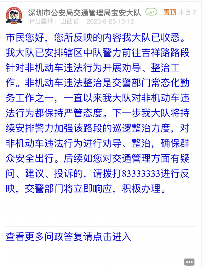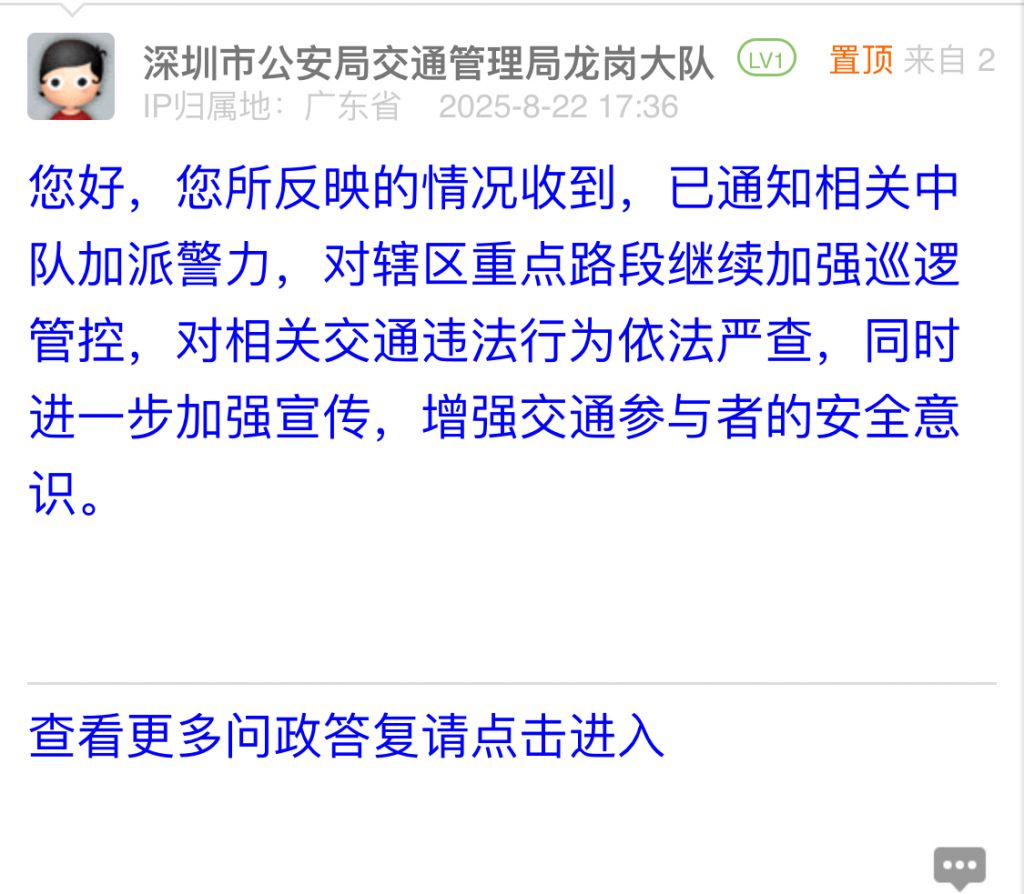 據統計,2025年8月18日-2025年8月24日,網友在深圳論壇發布問政類帖文共40篇,得到相關單位正式回應的帖文數為40篇,本期簡報回應速度最快的單位:市公安局交通管理局寶安大隊、市公安局交通管理局羅湖大隊、羅湖區翠竹街道辦事處、市生態環境局寶安管理局、龍崗區城市管理和綜合執法局。