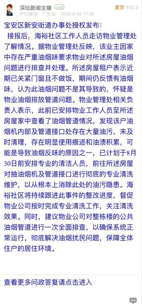 接報后,海裕社區工作人員走訪物業管理處了解情況。據物業管理處反映,該業主因家中存在嚴重油煙味要求物業對所述房屋油煙問題進行排查并處理。所述房屋租戶表示近期已關緊門窗且不做飯,期間仍反饋有油煙味,認為此油煙問題不是其導致的,懷疑是物業油煙排放管道問題。物業管理處相關負責人表示,此前已安排物業工作人員至所述房屋家中查看了油煙管道情況,發現該戶油煙機內部及管道接口處存在大量油污,未及時清理,存在明顯使用痕跡和油漬積累,可能是導致油煙反味的原因之一,已計劃于8月30日前安排專業的清潔人員,前往所述房屋對抽油煙機及管道接口進行徹底的專業清洗維護,以從根本上消除此處的油污隱患。海裕社區將持續跟進此事件的整改進度,督促物業公司按時完成專業清洗工作,關注清洗效果。同時,建議物業公司對整棟樓的公共油煙管道進行一次全面排查,以確保系統正常運行,徹底解決油煙擾民問題,保障全體住戶的居住環境。