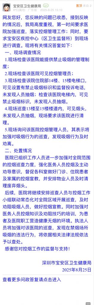 網友您好,您反映的問題已收悉,接到反映的情況后,我局高度重視,第一時間要求醫院加強巡查,落實控煙管理工作;同時,要求寶安區疾控中心(區衛生監督所)到現場進行調查。現將有關情況答復如下: