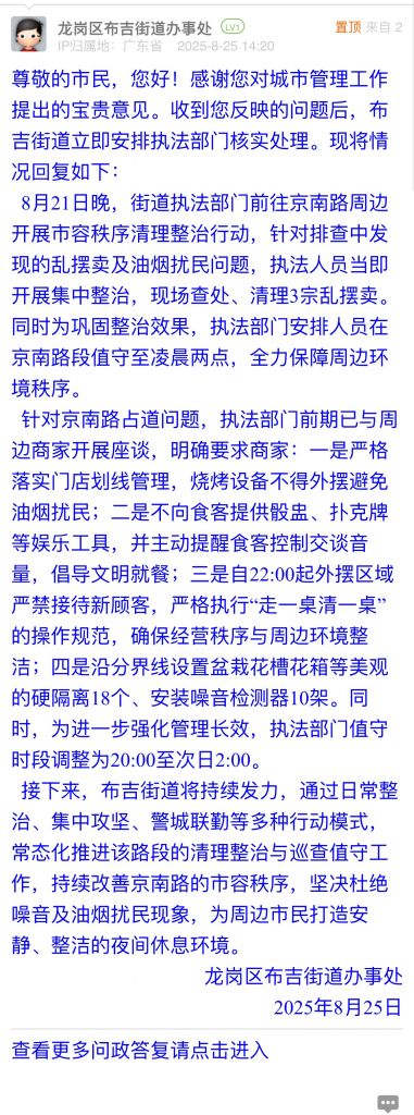 接下來,布吉街道將持續發力,通過日常整治、集中攻堅、警城聯勤等多種行動模式,常態化推進該路段的清理整治與巡查值守工作,持續改善京南路的市容秩序,堅決杜絕噪音及油煙擾民現象,為周邊市民打造安靜、整潔的夜間休息環境。