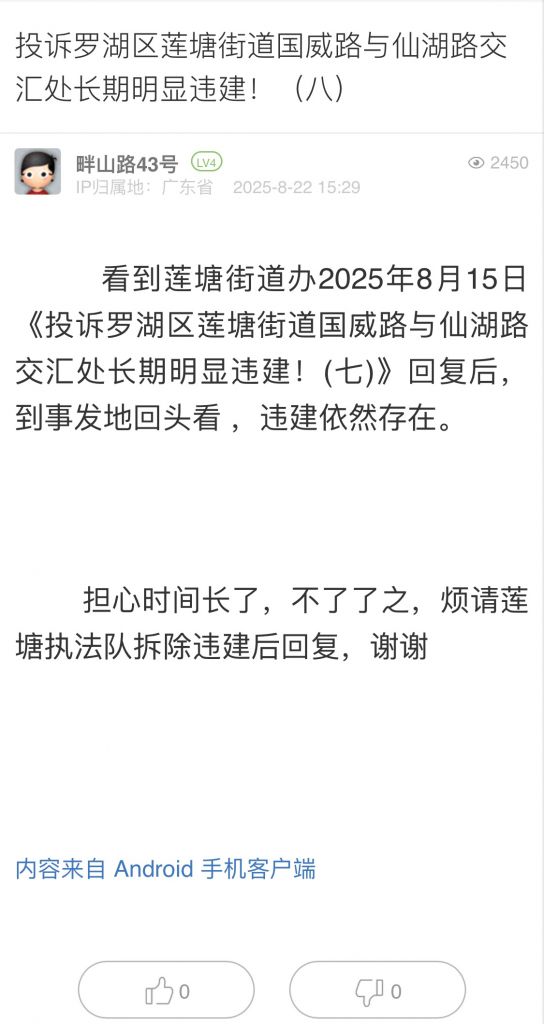 29. 帖文《投訴羅湖區蓮塘街道國威路與仙湖路交匯處長期明顯違建!(八)》
