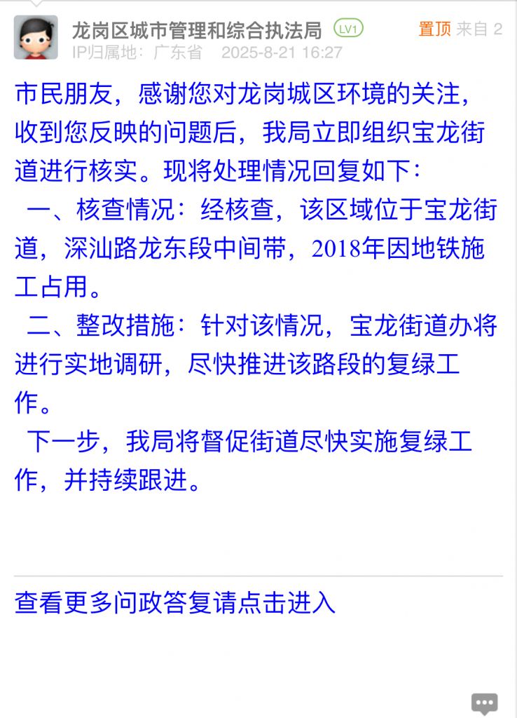 市民朋友,感謝您對龍崗城區環境的關注,收到您反映的問題后,我局立即組織寶龍街道進行核實。現將處理情況回復如下: