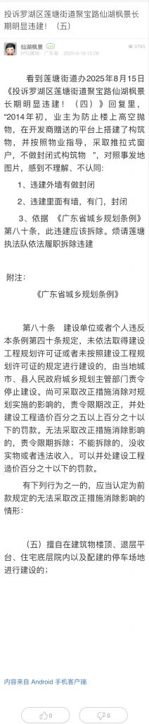 3. 帖文《投訴羅湖區蓮塘街道聚寶路仙湖楓景長期明顯違建!(五)》