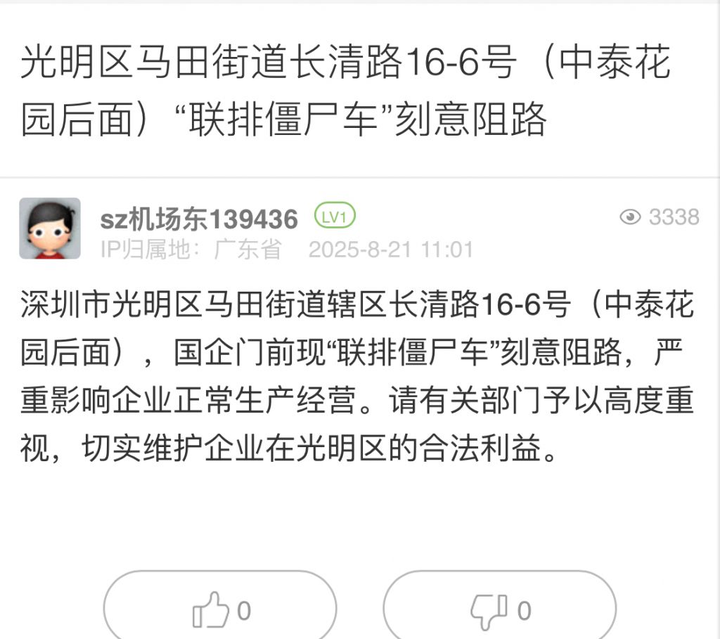 19. 帖文《光明區馬田街道長清路16-6號(中泰花園后面)“聯排僵尸車”刻意阻路》