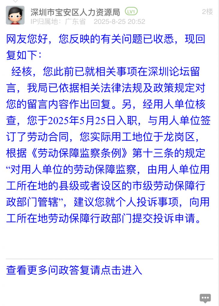 經核,您此前已就相關事項在深圳論壇留言,我局已依據相關法律法規及政策規定對您的留言內容作出回復。另,經用人單位核查,您于2025年5月25日入職,與用人單位簽訂了勞動合同,您實際用工地位于龍崗區,根據《勞動保障監察條例》第十三條的規定“對用人單位的勞動保障監察,由用人單位用工所在地的縣級或者設區的市級勞動保障行政部門管轄”,建議您就個人投訴事項,向用工所在地勞動保障行政部門提交投訴申請。