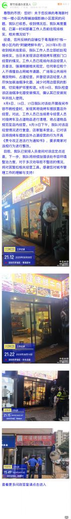 經查,您所反映的店鋪位于粵海新村7棟一樓小區內的“阿健烤鮮牛肉”。2025年8月1日收到相關線索后,我隊工作人員立即趕赴現場核實。當日未發現該店將燒烤車擺放門口經營的情況。工作人員已現場向該店經營人員普法,強調根據相關規定,任何單位和個人不得擅自占用城市道路、廣場等公共場所堆放物料、占道經營。并督促該店經營人員盡快加裝油煙凈化器,減少對周邊居民的影響,切實維護鄰里和諧。8月14日,我隊檢查該店油煙凈化器安裝情況,確認其已安裝完畢并投入使用。