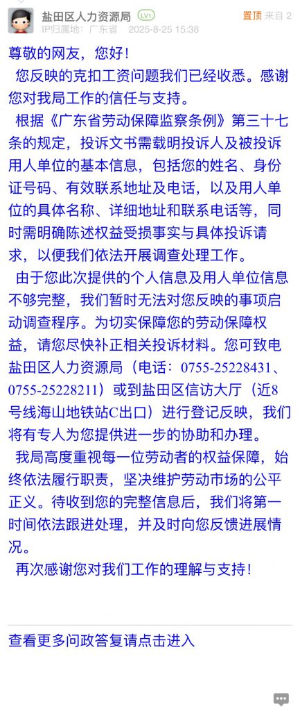 由于您此次提供的個人信息及用人單位信息不夠完整,我們暫時無法對您反映的事項啟動調查程序。為切實保障您的勞動保障權益,請您盡快補正相關投訴材料。您可致電鹽田區人力資源局(電話:0755-25228431、0755-25228211)或到鹽田區信訪大廳(近8號線海山地鐵站C出口)進行登記反映,我們將有專人為您提供進一步的協助和辦理。