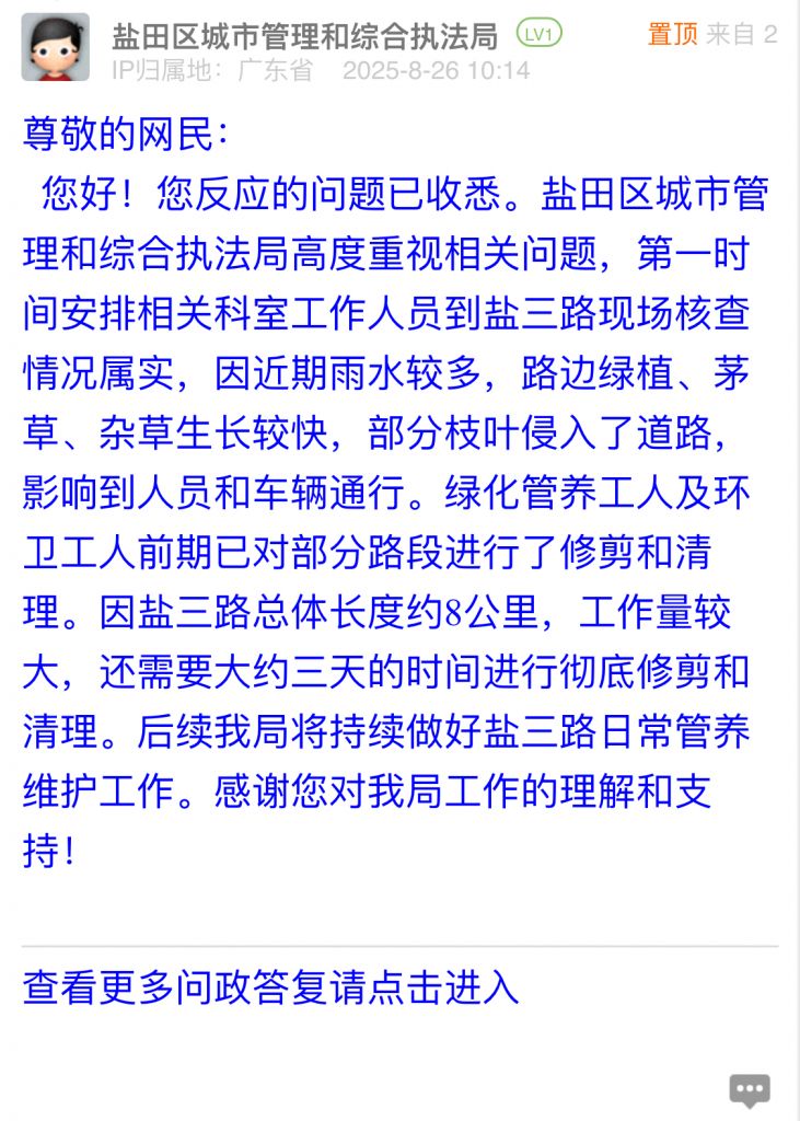 您好!您反應的問題已收悉。鹽田區城市管理和綜合執法局高度重視相關問題,第一時間安排相關科室工作人員到鹽三路現場核查情況屬實,因近期雨水較多,路邊綠植、茅草、雜草生長較快,部分枝葉侵入了道路,影響到人員和車輛通行。綠化管養工人及環衛工人前期已對部分路段進行了修剪和清理。因鹽三路總體長度約8公里,工作量較大,還需要大約三天的時間進行徹底修剪和清理。后續我局將持續做好鹽三路日常管養維護工作。感謝您對我局工作的理解和支持!