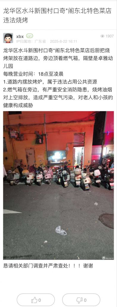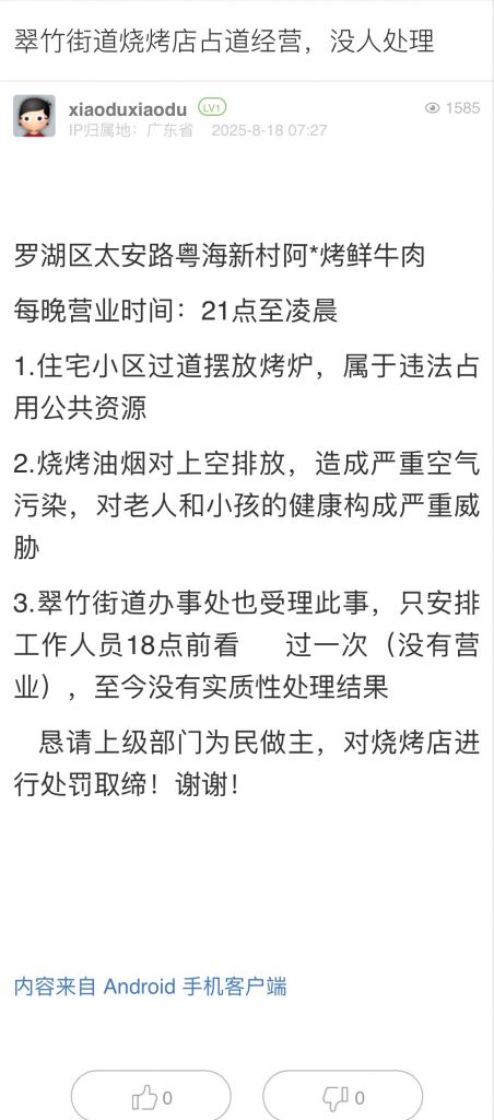 1. 帖文《翠竹街道燒烤店占道經營,沒人處理》