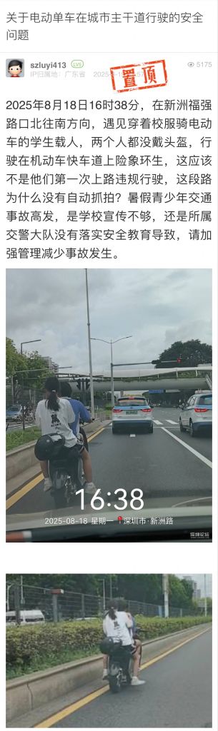 網友您好,關于您反映的新洲路南往北方向電動車違規駕駛行為的問題福田大隊已收悉并轉轄區中隊核查,對兩名電動車騎乘人開展批評教育。福田交警在節假日、開學等時間節點均開展多次交通安全進校園工作,同步加強護校崗工作,增加護校、護學警力。臨近開學,福田交警將與福田區教育局共同開展交通安全開學第一課,做好未成年人交通安全保障工作。感謝您對交通工作的理解與支持!