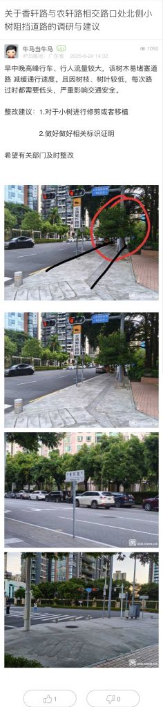 40. 帖文《關于香軒路與農軒路相交路口處北側小樹阻擋道路的調研與建議》