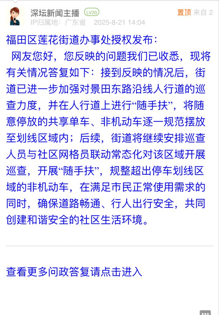 各職能單位如需對網友反映的問題進行回應,可在深圳論壇注冊官方賬號并通過認證,回帖進行回應。