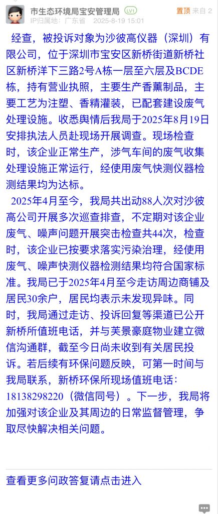 經查,被投訴對象為沙彼高儀器(深圳)有限公司,位于深圳市寶安區新橋街道新橋社區新橋洋下三路2號A棟一層至六層及BCDE棟,持有營業執照,主要生產香薰制品,主要工藝為注塑、香精灌裝,已配套建設廢氣處理設施。收悉輿情后我局于2025年8月19日安排執法人員赴現場開展調查。現場檢查時,該企業正常生產,涉氣車間的廢氣收集處理設施正常運行,經使用廢氣快測儀器檢測結果均為達標。