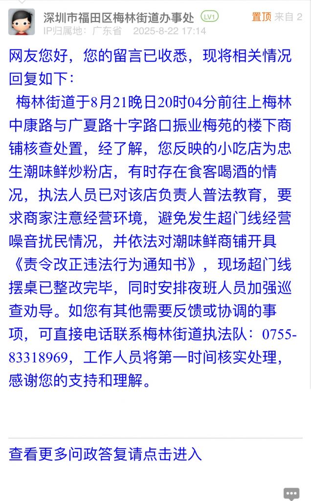 梅林街道于8月21晚日20時04分前往上梅林中康路與廣夏路十字路口振業梅苑的樓下商鋪核查處置,經了解,您反映的小吃店為忠生潮味鮮炒粉店,有時存在食客喝酒的情況,執法人員已對該店負責人普法教育,要求商家注意經營環境,避免發生超門線經營噪音擾民情況,并依法對潮味鮮商鋪開具《責令改正違法行為通知書》,現場超門線擺桌已整改完畢,同時安排夜班人員加強巡查勸導。如您有其他需要反饋或協調的事項,可直接電話聯系梅林街道執法隊:0755-83318969,工作人員將第一時間核實處理,感謝您的支持和理解。