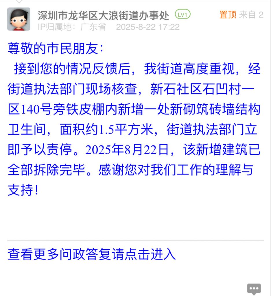 接到您的情況反饋后,我街道高度重視,經街道執法部門現場核查,新石社區石凹村一區140號旁鐵皮棚內新增一處新砌筑磚墻結構衛生間,面積約1.5平方米,街道執法部門立即予以責停。2025年8月22日,該新增建筑已全部拆除完畢。感謝您對我們工作的理解與支持!