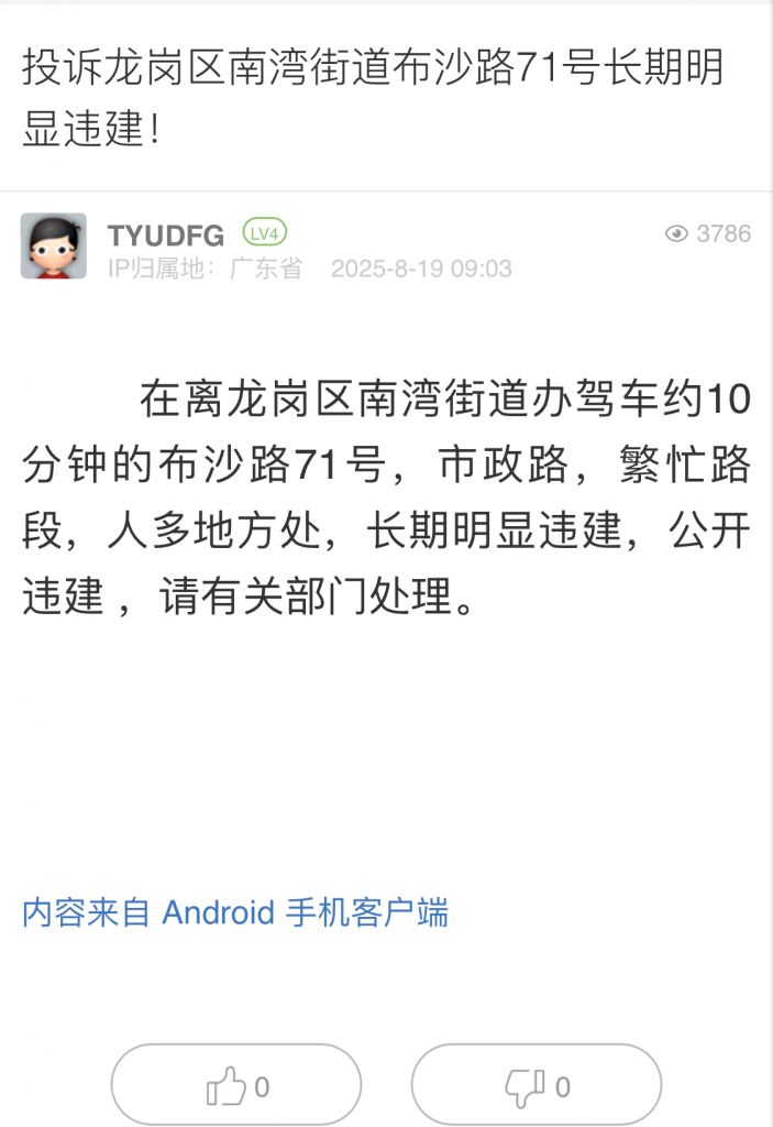 5. 帖文《投訴龍崗區南灣街道布沙路71號長期明顯違建!》
